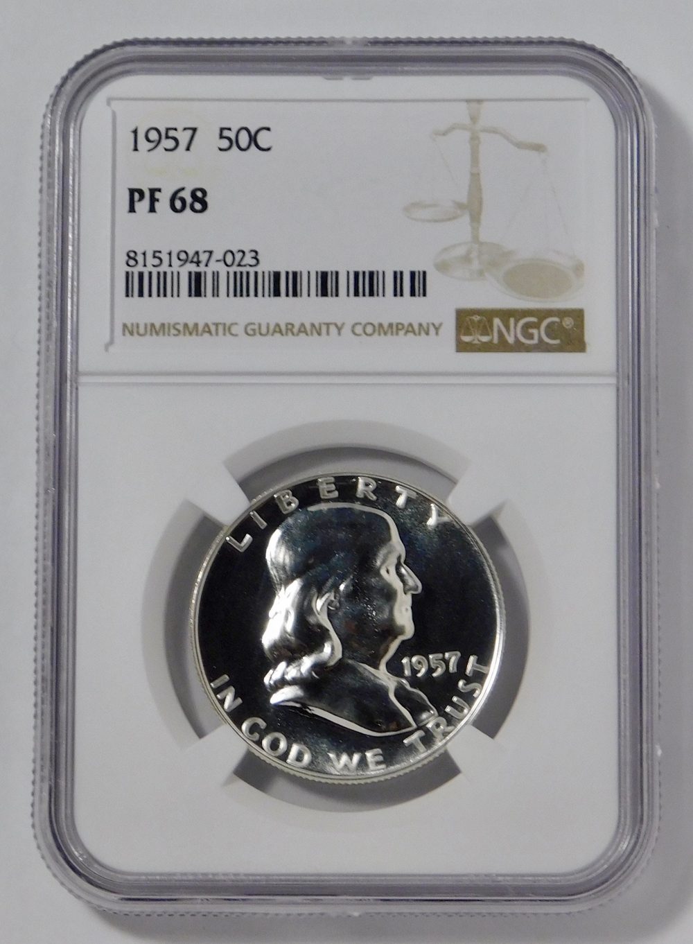 1957 Silver Franklin Half Dollar. HIGH GRADE. Graded by NGC Gem Proof 68. NGC Price Guide $125.00. Very nice details and surfaces. Great Eye Appeal